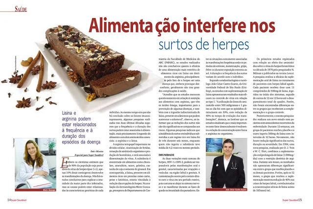A arginina tem papel importante na divisão celular, cicatrização de feridas, remoção de amônia do organismo e produção de hormônios, e está associada à disseminação do vírus. A substância é encontrada em alimentos como chocolate, amendoim, nozes, gelatina, castanha de caju e semente de girassol. Em contrapartida, a lisina, presente em alimentos ricos em proteína como carne, peixe e laticínios, estaria vinculada à redução das erupções de herpes. Na avaliação da dermatologista Meire Gonzaga, preceptora do Departamento de Cosmiatria da Faculdade de Medicina do ABC (FMABC), os estudos realizados não são conclusivos quanto à eficácia de uma alimentação mais restritiva de alimentos ricos em lisina em detrimento da arginina, principalmente pelo fato de o herpes ser uma doença que, embora provoque desconforto, geralmente não traz grandes complicações à saúde.